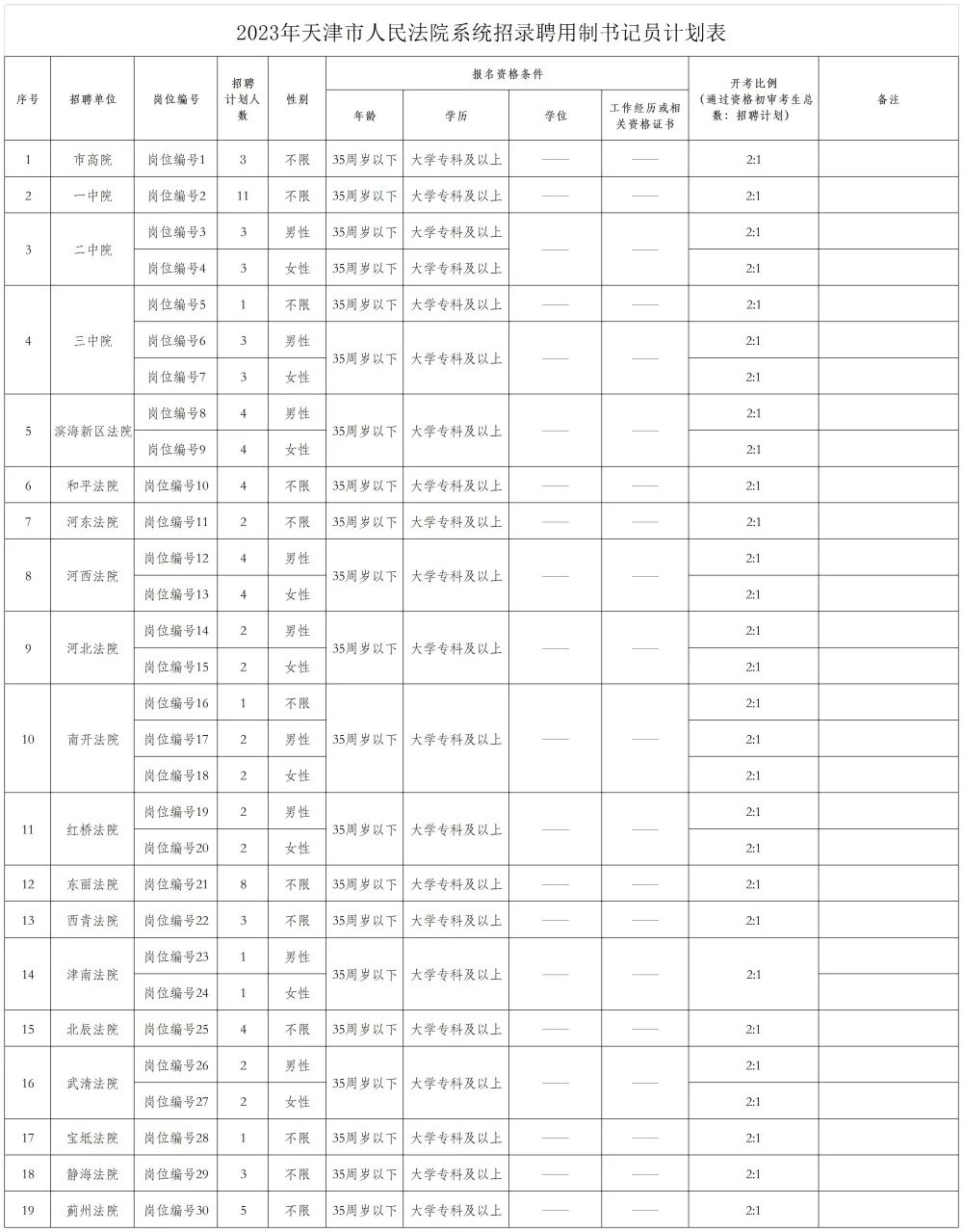本次各招聘单位共计划招录92名聘用制书记员,各招聘单位招聘数量及具体资格条件见附件1《2023年天津市人民法院公开招录聘用制书记员计划表》。