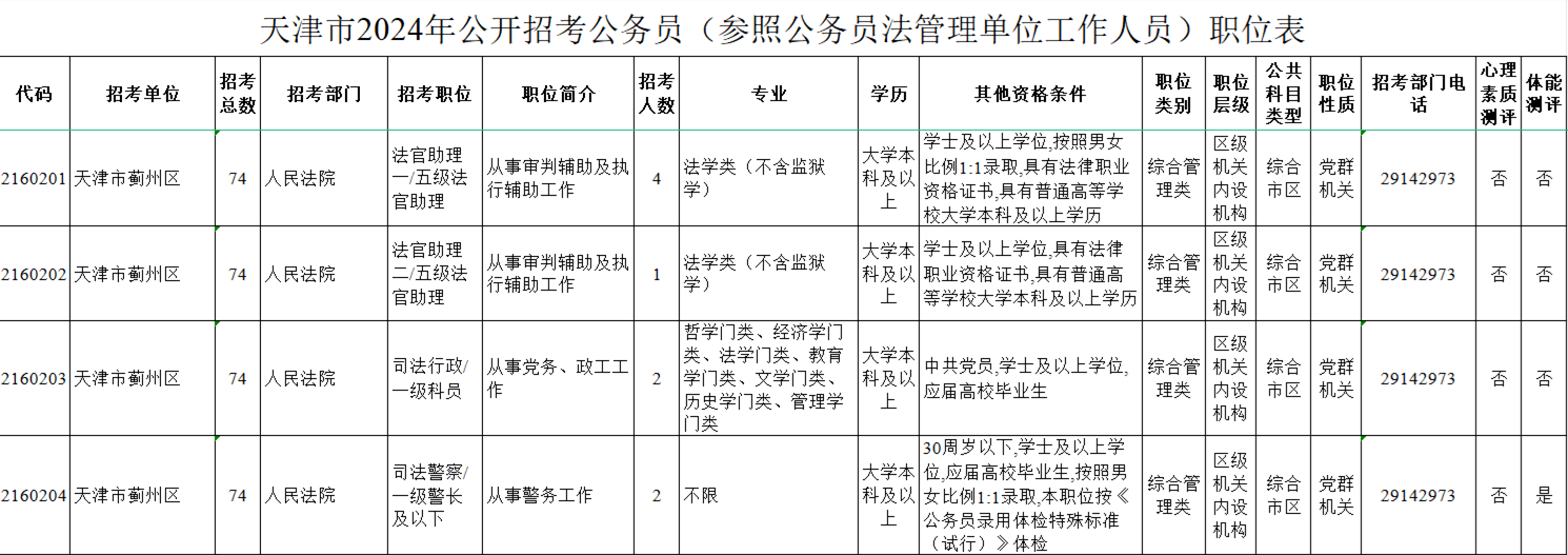 天津市公务员局发布《天津市2024年公开招考公务员公告》,天津市蓟州区人民法院根据计划招录9人。